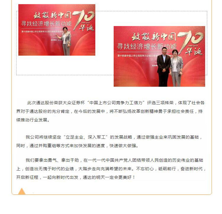 【概要描述】由《大众证券报》主办的中国上市公司竞争力公信力调查活动,自2005年至今已连续成功举办到第十四届。该活动自开办以来,吸引了包括经济学家、证券市场代表以及众多投资者在内的各界人士的积极参与。活动中产生的各奖项均经过严格的考评流程,客观准确地记录了上市公司在证券市场的表现,因此这些奖项成为投资者了解评估上市公司整体表现的重要参考,在资本市场备受关注。作为今年三项大奖的获得者,通达股份于2011年3月在