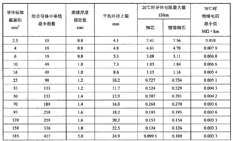 表 2 BVR型 450/750V铜芯聚氯乙烯绝缘软电缆