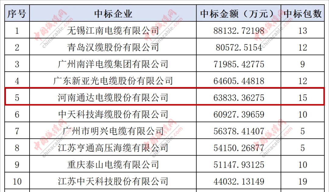 电线电缆被誉为国民经济的“血管”与“神经”,在确保我国电力稳定供应、促进经济稳健增长以及提升能源使用效率方面发挥着举足轻重的作用。截至2024年12月31日,国家电网总部和南方电网有限公司的2024年度线缆物资招标采购项目结果已全面公布,通达股份在2024年国家电网、南方电网总部线缆物资中标线缆企业排行榜中表现卓越,分别荣获第11名和第5名。