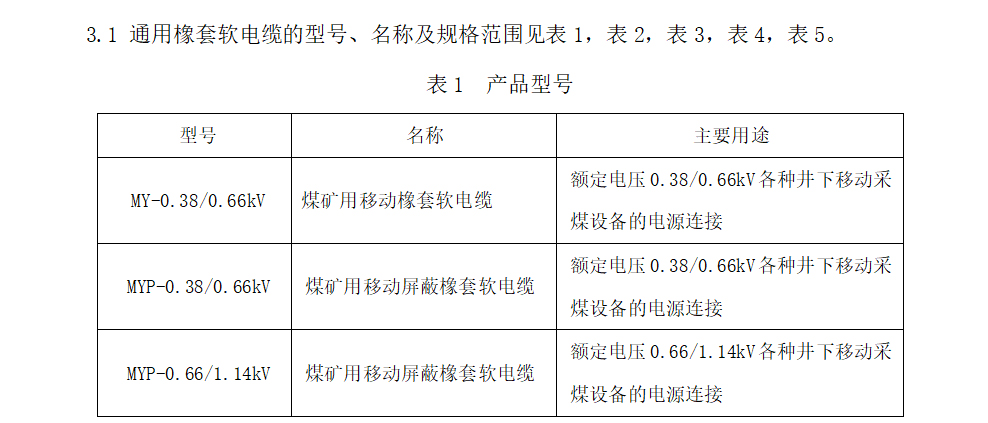 适用于额定电压U0/U为0.66/1.14kV及以下煤矿移动设备用铜芯软电缆。
