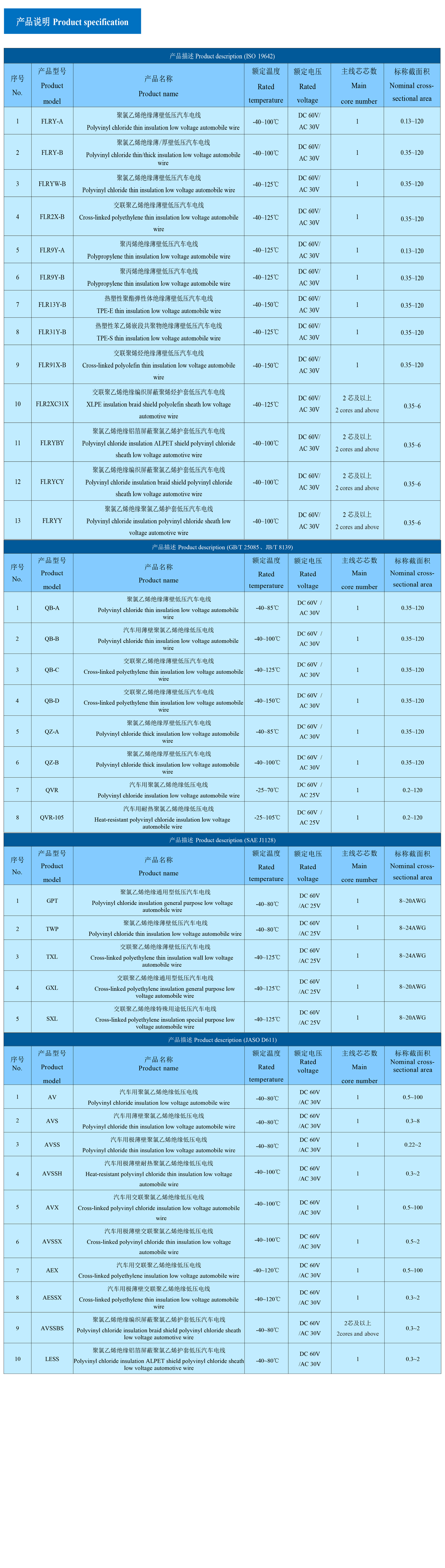 用途:适用于汽车内部各传感器、执行器和电子元器件,低压电缆在汽车中的应用非常广泛,例如发动机舱、底盘、车门、车灯、空调、座椅等部位。
