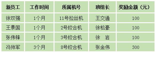 拉丝车间:三号拉丝机员工在本月工作中在质量、生产、7S方面表现突出被公司评为优秀三好班组:共2人(姚海良 高宇飞)。